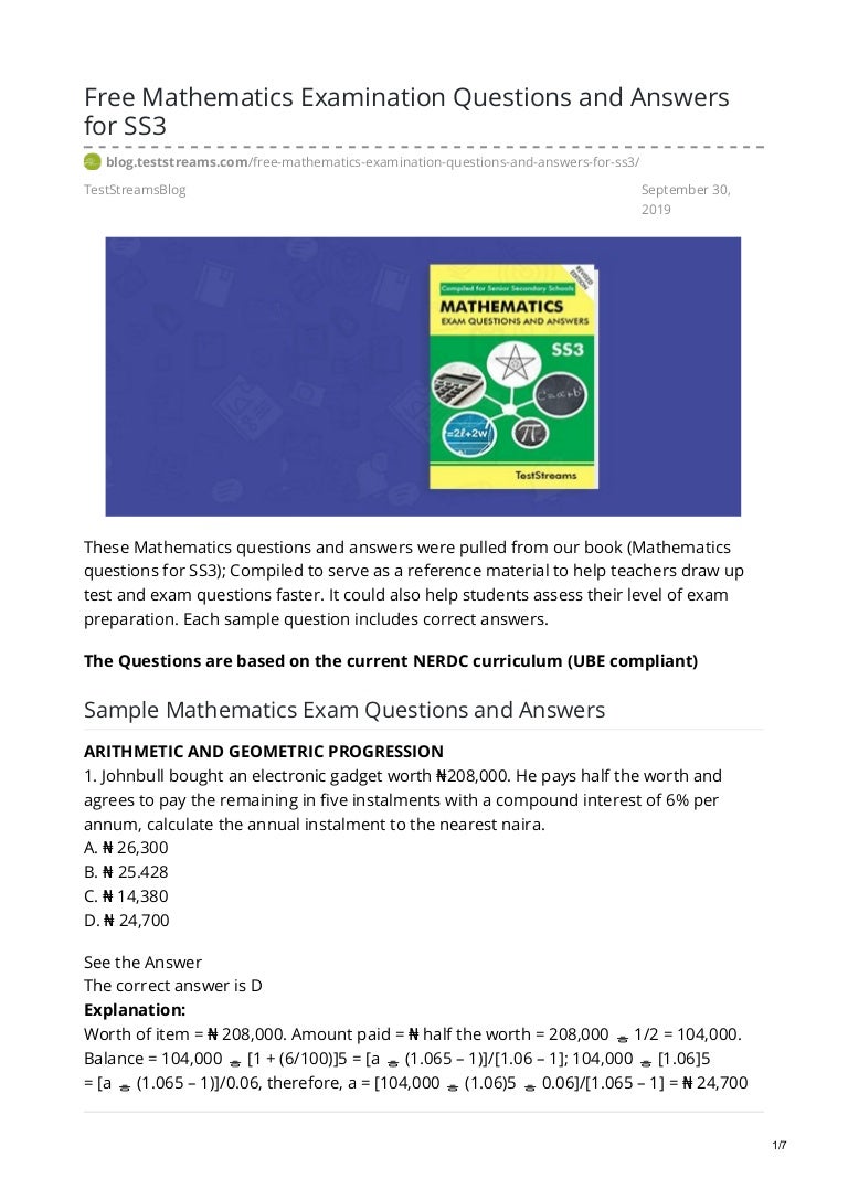 Free Mathematics Examination Questions And Answers For Ss3